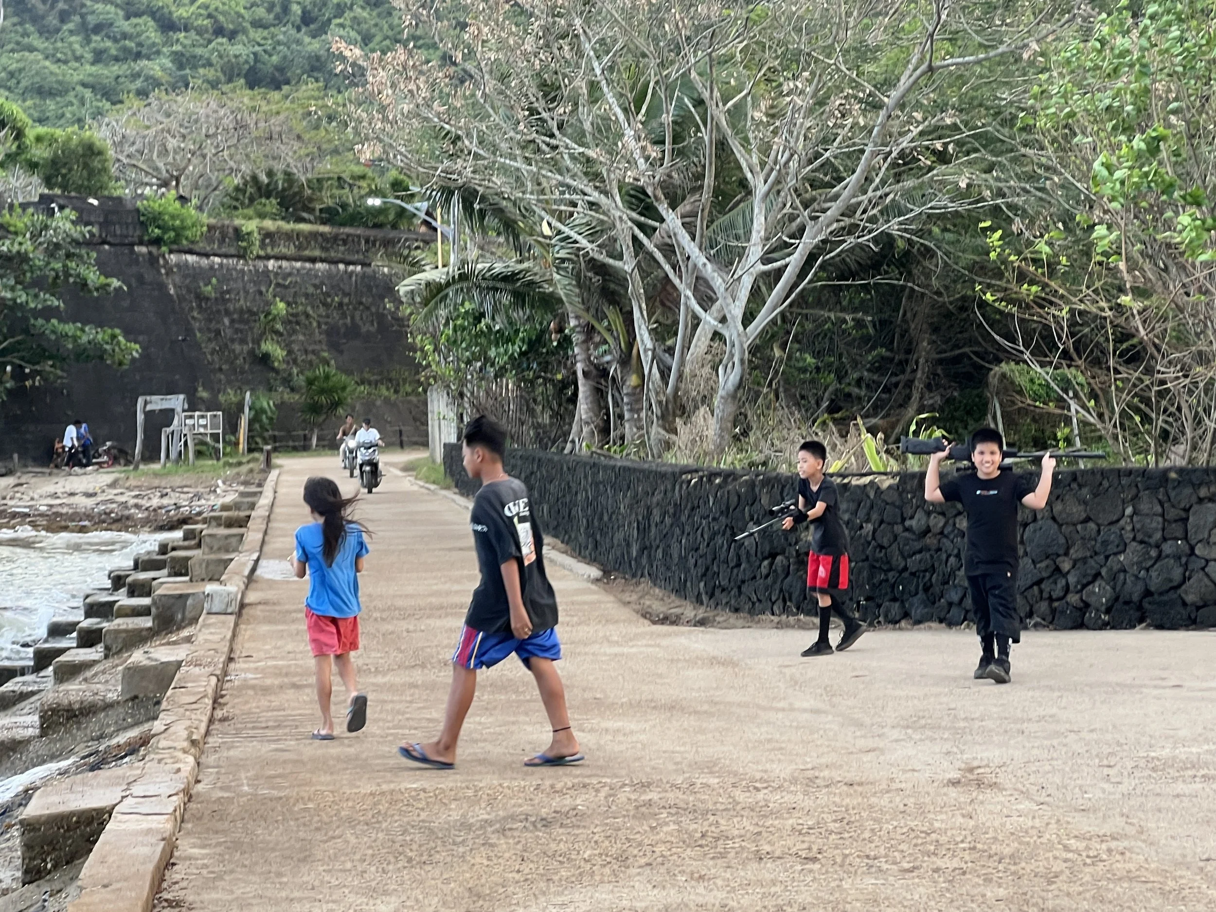 12-24 exploring Taytay the fishing village. kids so happy to be in a photo. little boys playing with toy machine guns. and the cutest little girl, Lorraine hanging out with me for a sunset while her father sat close by